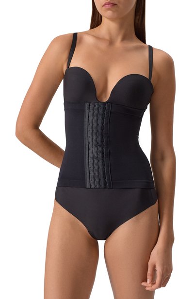 Корсет, сильно корректирующий талию, застегивается крючками с тремя позициями спереди. Для изготовления модели из коллекции Soft Touch использовали эластичную микрофибру.