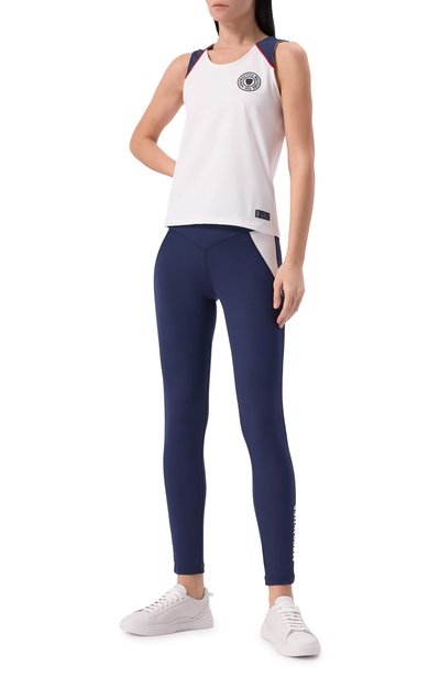 Легинсы Hailey с высокой посадкой сшили из гладкого микса нейлона и спандекса. Широкий пояс модели дополнили потайным карманом и серебристой эмблемой марки.