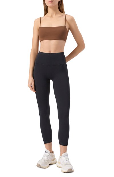 Кроп-топ с узкими бретелями изготовили из эластичной нейлоновой микрофибры. Принадлежность бра марке обозначили логотипом на спинке.