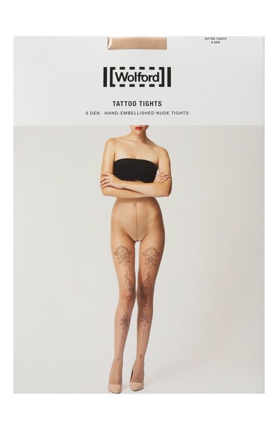 Прозрачные колготки Tattoo Tights плотностью 8 ден выполнили из эластичного полиамида. Изделие с широким поясом украсили спереди восточным принтом, напоминающим орнаменты из хны.