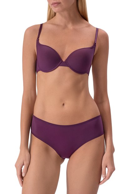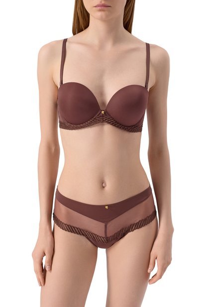 Бюстгальтер с треугольными формованными чашечками выполнили из смесовой микрофибры на основе полиуретана. Посадку модели из коллекции Sensation Plaisir можно регулировать слайдерами на бретелях и крючками на широком поясе с тремя вариантами объема.