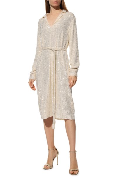 Длинное платье с пуговицей на вырезе сзади выполнили из полупрозрачного полиэстера. Модель полностью расшили бусинами и миниатюрными пайетками. В комплекте — короткое нижнее платье с тонкими бретелями.