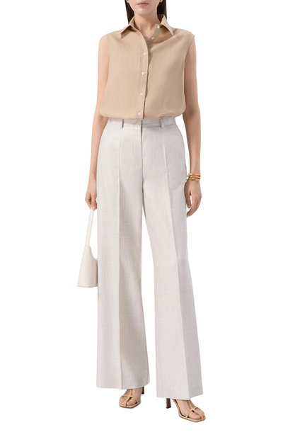 Широкие брюки с эластичной вставкой на поясе сзади станут комфортной основой летних образов. Для пошива модели с боковыми карманами использовали ткань изо льна и тенсела.