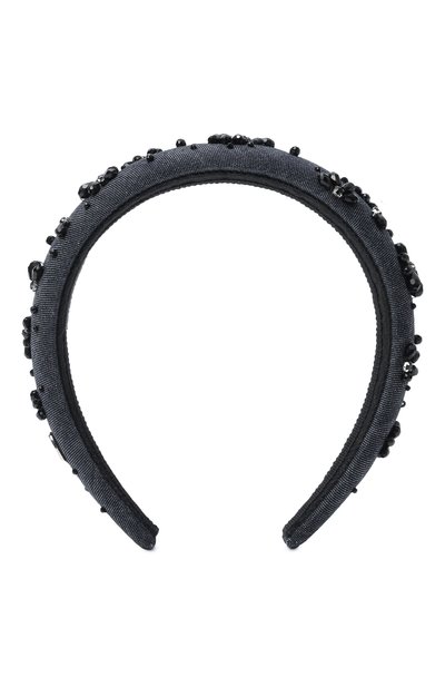 Широкий объемный ободок с гибким каркасом и отделкой из репсовой ленты на внутренней стороне обтянули плотным денимом. Аксессуар декорировали брендированной пластиной и цветочным мотивом из граненых бусин.