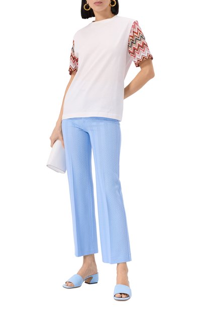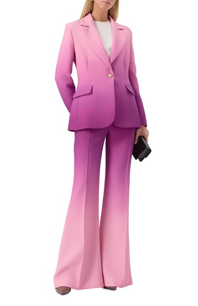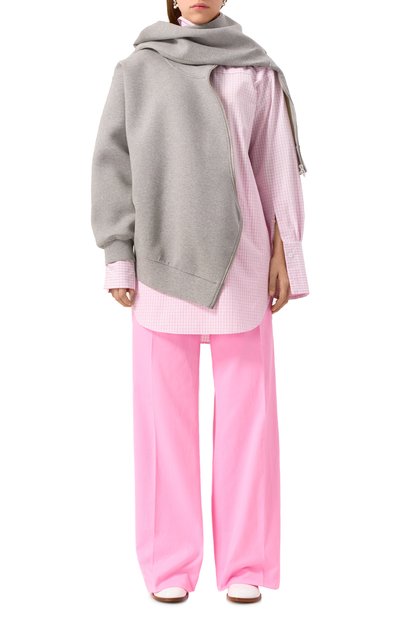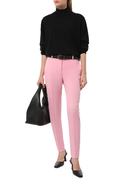 Брюки с вырезом на поясе дополнили боковыми и задними врезными карманами. Для изготовления модели использовали эластичную костюмную шерсть.