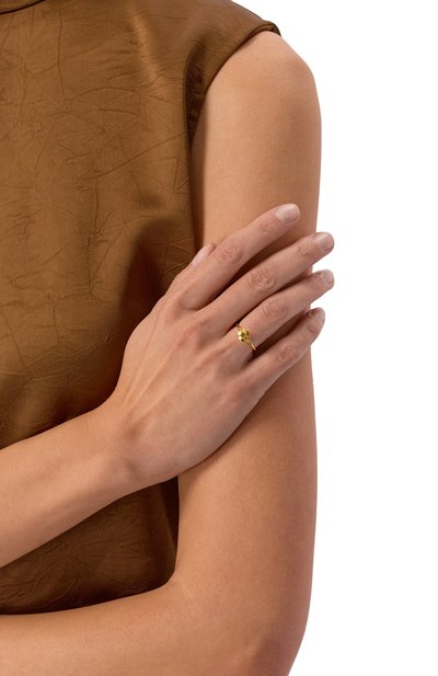 Кольцо из коллекции Cartoon Hearts выполнили из серебра 925-й пробы с гальваническим покрытием желтым золотом. Аксессуар с объемной полой шинкой декорировали сердцем из зеленого агата.