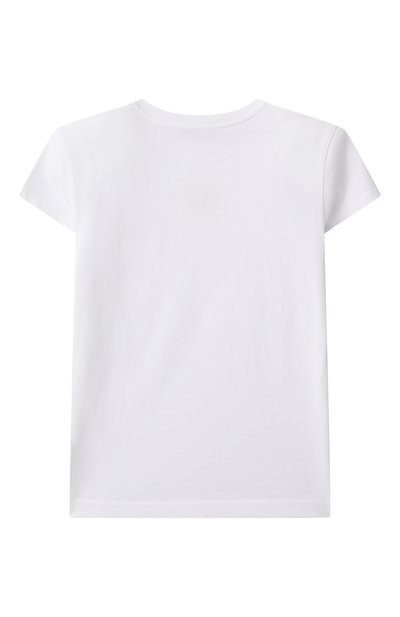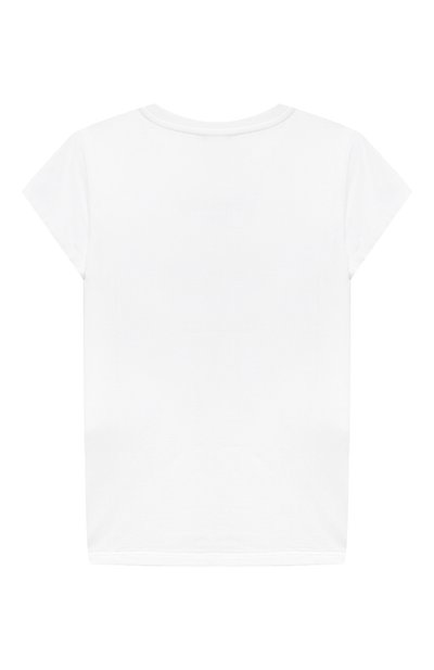 Прямую футболку выполнили из хлопкового джерси. Проймы изделия спереди подчеркнули фирменными пуговицами Chain Lion, а сзади модель украсили контра стным принтом Balmain Couture.