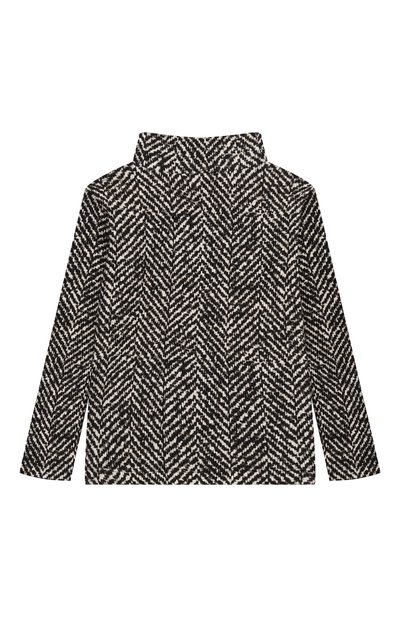 Водолазку в горизонтальную полоску выполнили из ребристого трикотажа на основе шерсти и хлопка. Левое плечо подчеркнули фирменными пуговицами, а боковые швы – брендированными лентами.