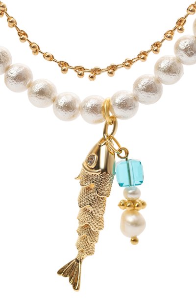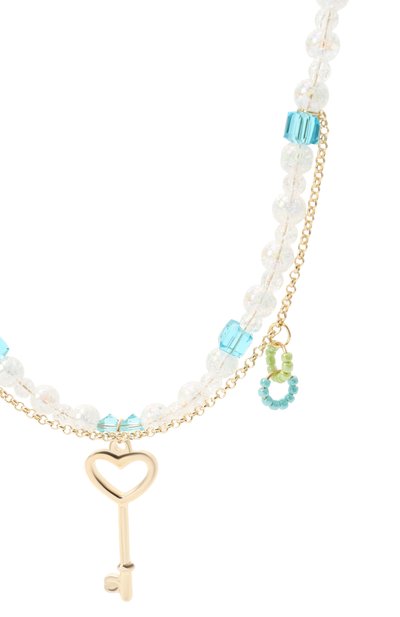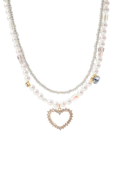 Двухниточное колье с застежкой-карабином собрали из натурального жемчуга и бисера. Аксессуар украсили цветными кристаллами Swarovski и сверкающей подвеской-сердцем.