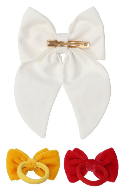Комплект School из трех бантов изготовили из бархата. Один аксессуар с вышивкой, кристаллами и бусинами на концах дополнили металлическим зажимом, а два дру гих — текстильными резинками в тон.