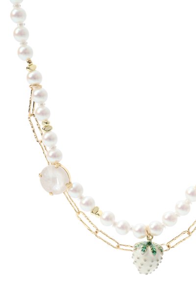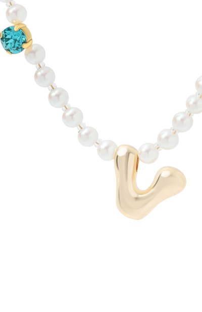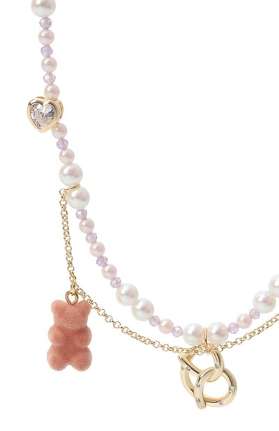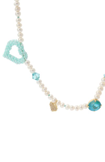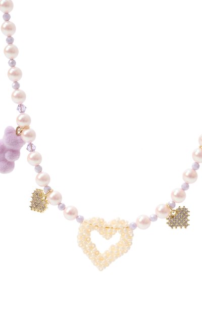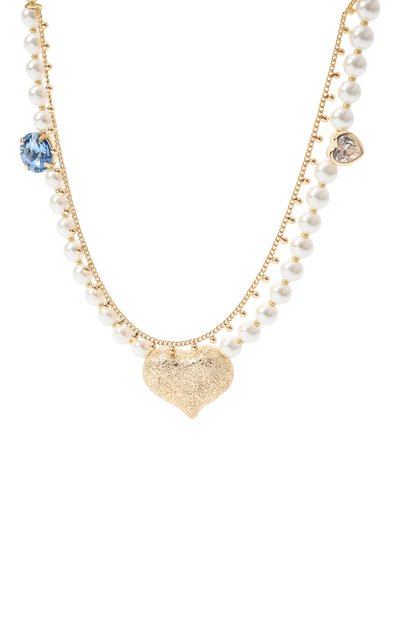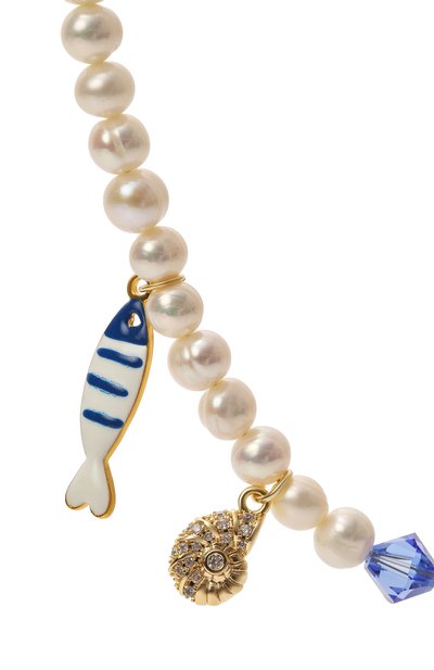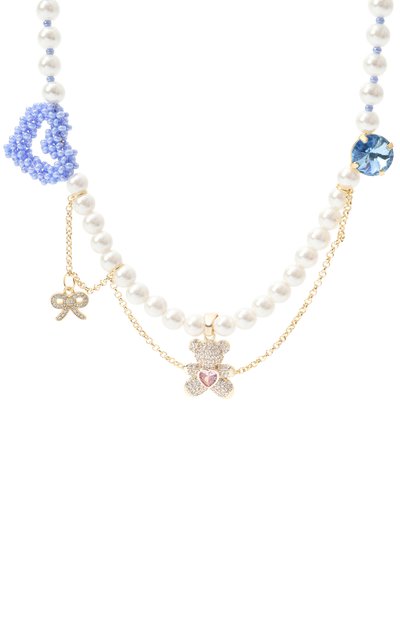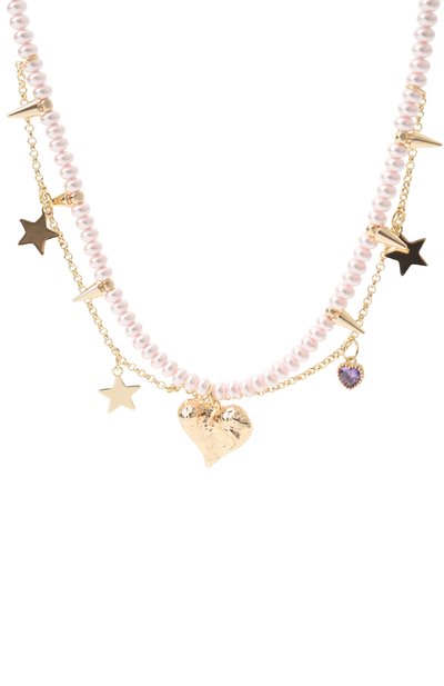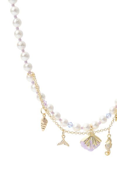 Колье из искусственного жемчуга и граненых бусин дополнили фигурными шармами и подвесками, две из которых закрепили на декоративной цепочке. Регулируемая модель застегивается замком «лобстер».