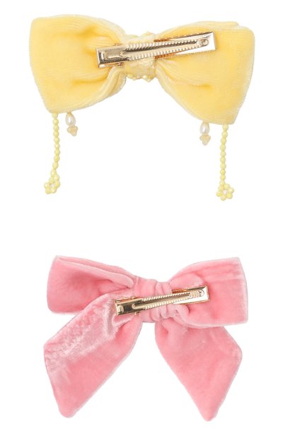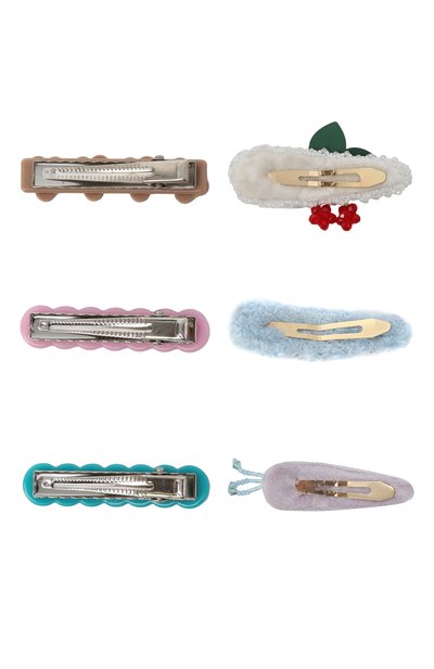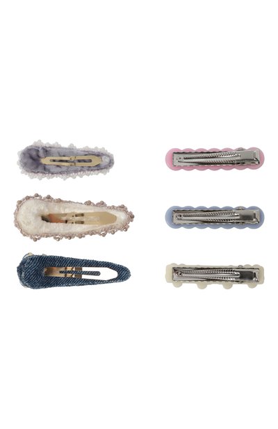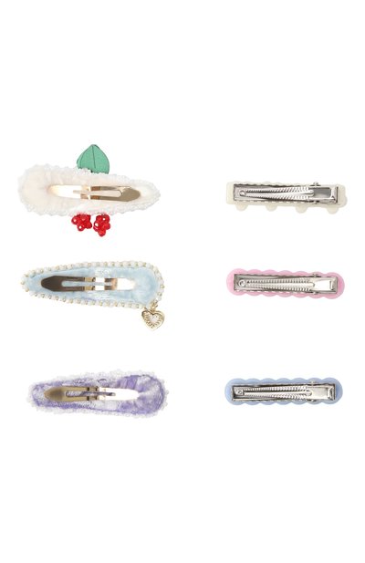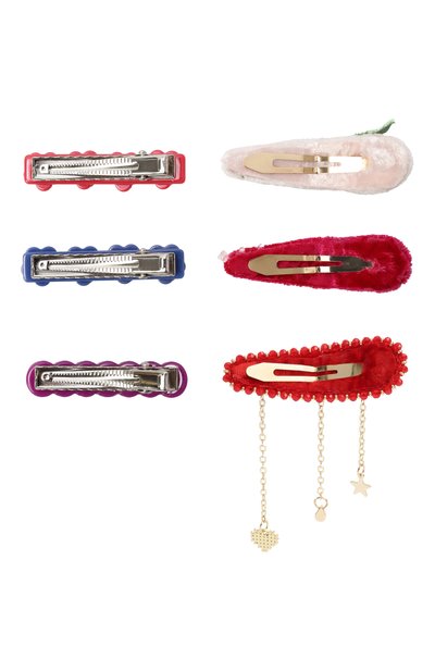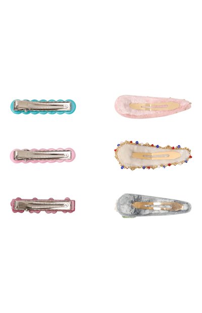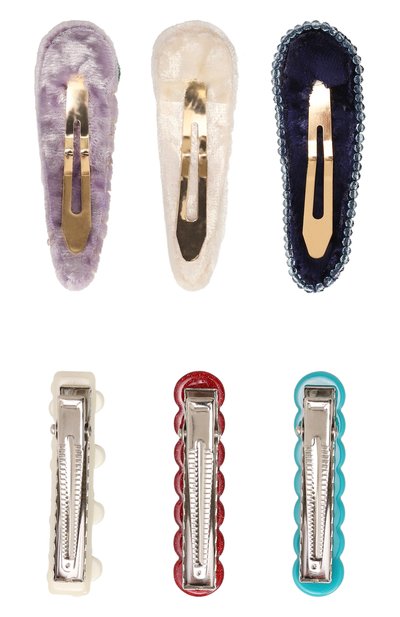 Комплект состоит из шести заколок с зажимами двух видов. Одна часть аксессуаров изготовлена из пластика, другая обтянута бархатом и украшена бисером, подвесками и кристаллами.