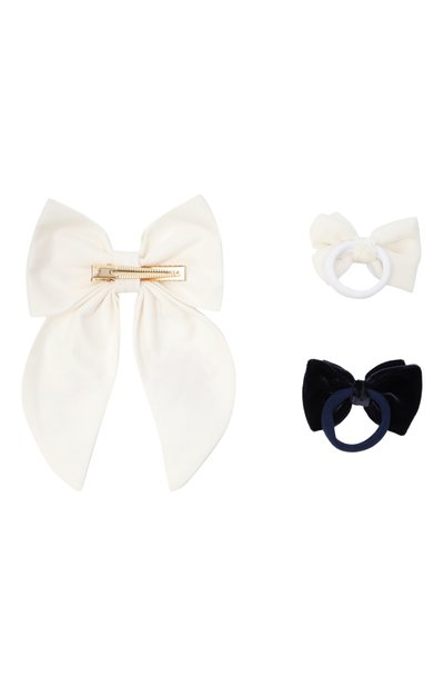 К омплект School состоит из трех аксессуаров с бантами. Два изделия с резинками выполнены из бархата, одно с заколкой и вышивкой бисером — из атласа.
