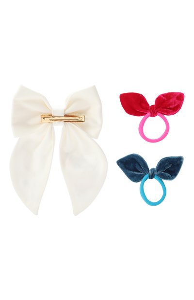 Заколку с зубчатым металлическим зажимом украсили объемным текстильным бантом с вышивкой в виде цифр и букв, подчеркнутой бисером. В комплект School включили еще две резинки с узлами из разноцветного бархата.