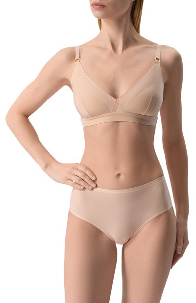В коллекцию New Apesanteur вошел бюстгальтер с мягкими треугольными чашечками и регулируемыми бретелями. Модель из нейлоновой лайкры и тюля оттенка Skin Rose застегивается двумя крючками.