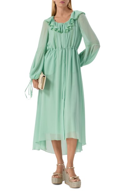 Макси-платье с потайной молнией на спинке и встречными складками на подоле сзади выполнили из крепа на основе вискозы. Длинную атласную драпировку, ниспадающую с одного плеча, декорировали по краям вышивкой серебристым бисером.