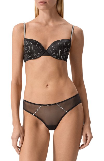 Бюстгальтер с плотными чашечками на косточках дополнили вкладышами, создающими эффект пуш ап. Модель из эластичного атласа с добавлением шелка украсили кристаллами Swarovski на узких регулируемых бретелях.