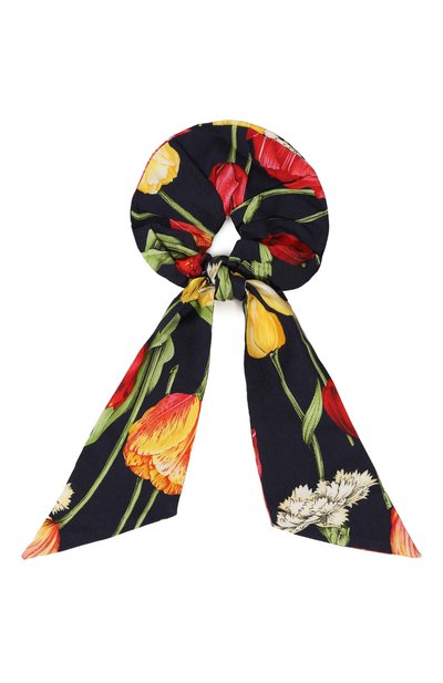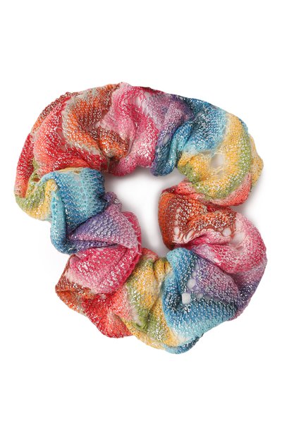 Резинку выполнили из текстиля с металлизированными нитями в составе. Аксессуар дополнили вставкой с узором, подчеркнутым кристаллами и пайетками.