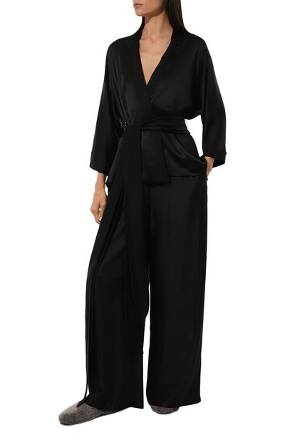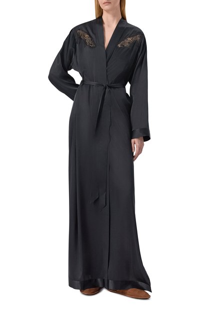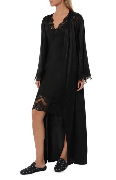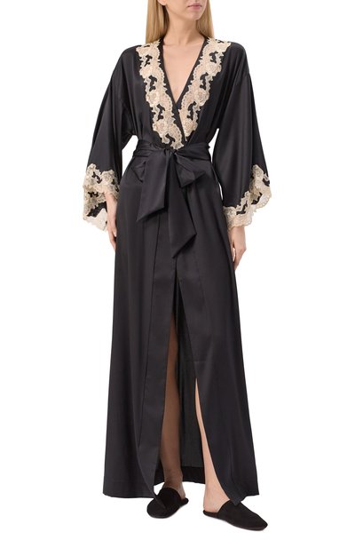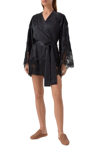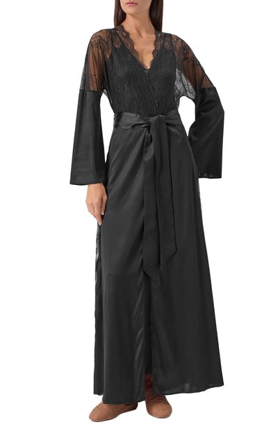 Длинный халат из линии Little Moments сшили из эластичного шелка. Широкие рукава отделали цветочным кружевом с фестончатыми краями. Модель дополнили поясом-лентой.