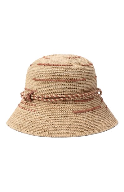 Шляпу Jemima сплели из бумажной соломки двух оттенков, создав геометричный орнамент. Аксессуар с широкими полями дополнили узким декоративным ремешком из зернистой кожи.