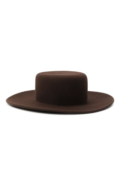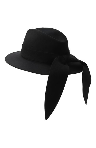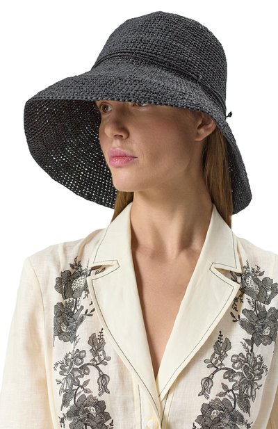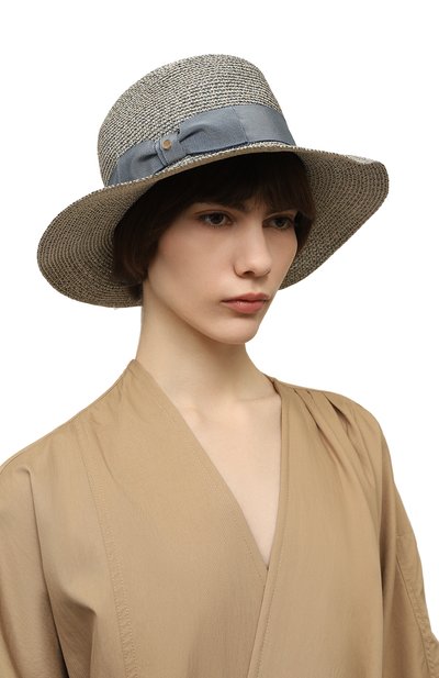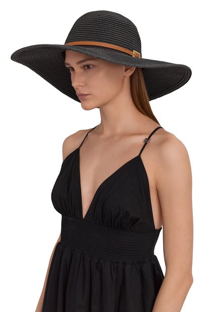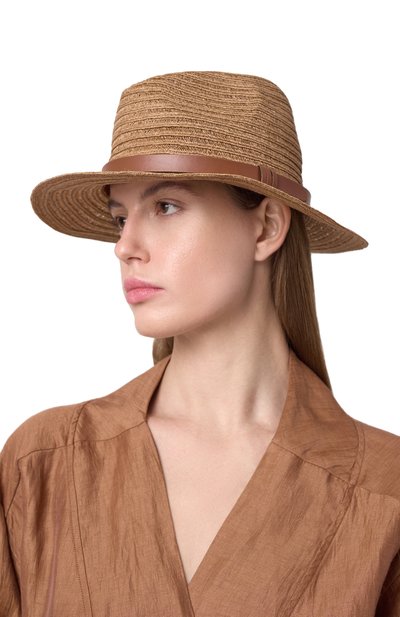 Широкополую шляпу Fedora сплели из легкой бумажной соломки. Высокую тулью с вмятиной подчеркнули репсовой лентой с золотистым брендированным медальоном.
