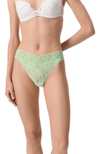 Для изготовления стрингов с V-образным поясом использовали фирменное цветочное кружево Signature Lace® на основе нейлона. Трусы с фестончатыми краями дополнили ластовицей из длинноволокнистого хлопка супима.