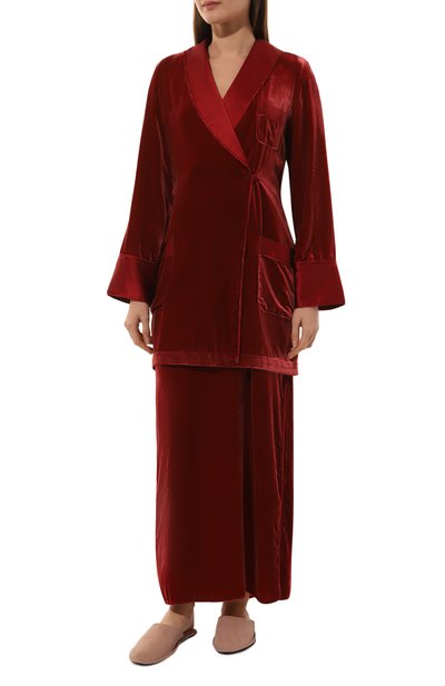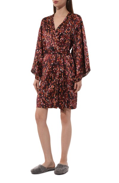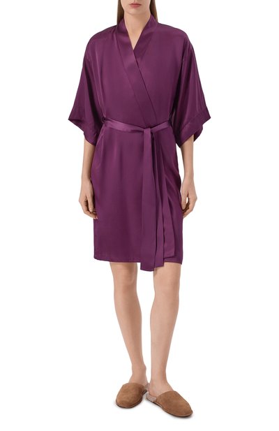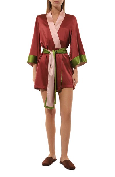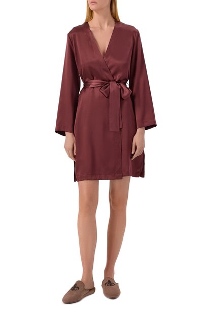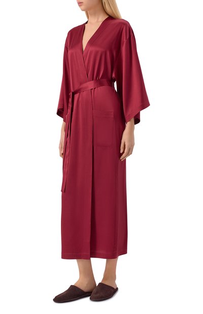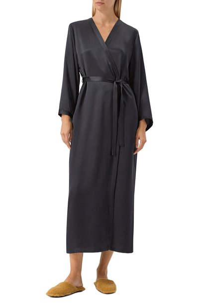 Для пошива длинного халата-кимоно из линии Tracy использовали шелковый атлас. Модель с врезными боковыми карманами дополнили узким поясом-лентой.