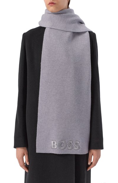 Широкий шарф связали узором в рубчик из тонкой шерсти с добавлением кашемира. Аксессуар с контрастным кантом на концах декорировали серебристой брендированной пластиной.