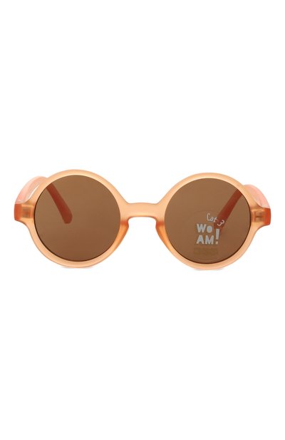 Оправу круглых солнцезащитных очков Woam выполнили из полупрозрачн ого полимерного материала с покрытием Soft Touch. Аксессуар с линзами, обеспечивающими 100 % защиты от УФ-излучения, декорировали на дужке названием модели.