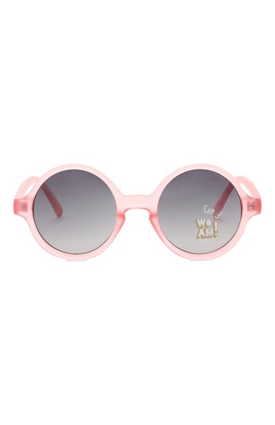 Оправу круглых очков Woam выполнили из полупрозрачного пол имерного материала. Одну из дужек аксессуара с темными линзами, блокирующими 100% ультрафиолетовых лучей, декорировали названием модели.