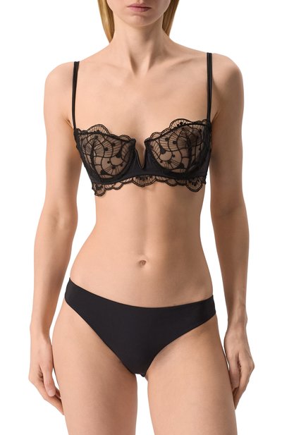 Трусы-танга Vista из комбинации гладкого атласа и цветочного кружева Leavers дополнены съемными регулируемыми бретелями. Белье с низкой посадкой украшено золотистыми пластинами сзади.