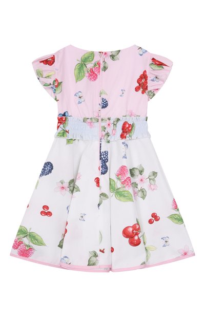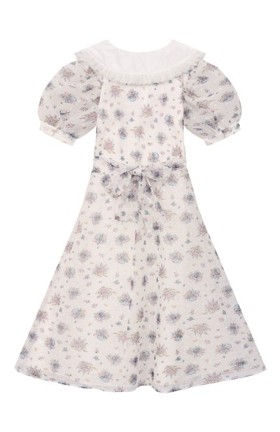 Платье из фатина с брендированным цветочным принтом застегивается потайной молнией сзади. Модель с бархатными отложным воротником и манжетами дополнили узким съемным поясом с бантом спереди.