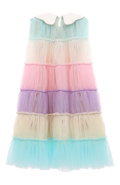 Платье с шелковистым подкладом из вискозы и потайной молнией на спинке выполнили из легкого тюля. Модель свободного кроя дополнили двухслойным отложным воротником и множеством оборок на подоле.