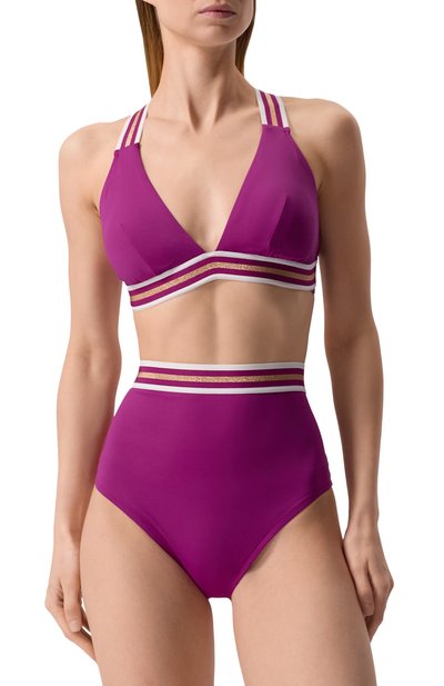 Для изготовления бра Ibiza использовали фактурный быстросохнущий материал стрейч с защитой от ультрафиолета SPF 50+. Между мягкими треугольными чашечками модель без застежки декорировали узлом.