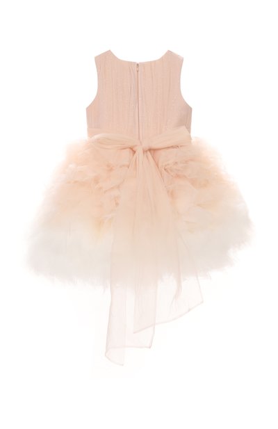 Платье Cake с потайной молнией на спинке выполнили из полиэстерового тюля, а для подкладки использовали хлопок. Лиф изделия украсили глиттером, а градиентный подол — оборками. Талию дополнили поясом, который завязывается на бант сзади.