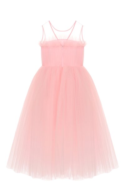 П латье Cake с глиттером на лифе выполнили из полиэстерового тюля, а для подкладки использовали хлопок. Модель с поясом, завязывающимся на бант сзади, и пышным градиентным подолом застегивается потайной молнией на спинке.