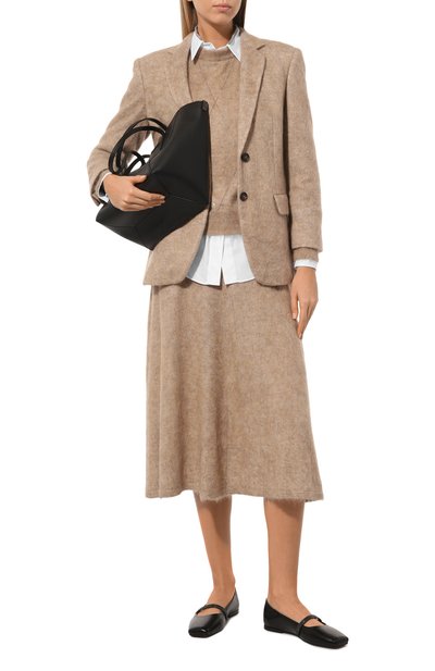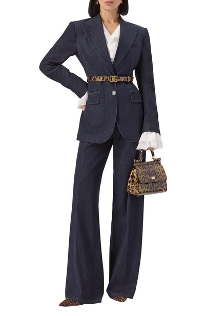 Жакет с английским воротником, приспущенной линией плеч и шлицей сзади дополнили боковыми карманами с клапанами. Для создания модели на трех роговых пуговицах использовали замшу ручной выделки, а для подклада — вискозу.