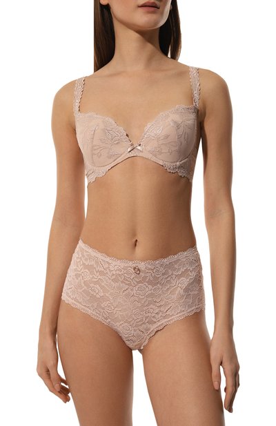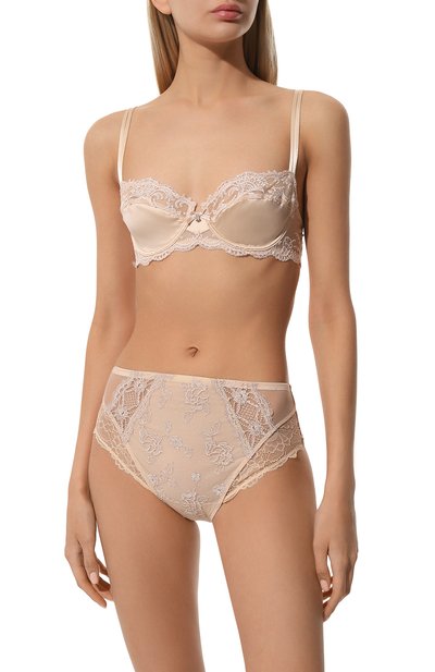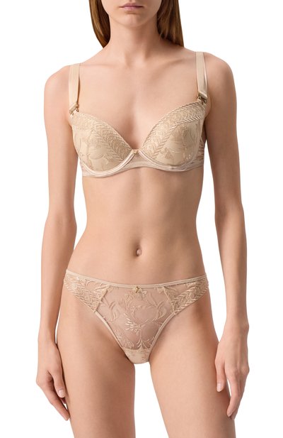 Бюстгальтер-балконет из линии Flawless Love сшили из ажурного кружева с цветками лотоса. Регулируемые бретели и перемычка между мягкими чашками на косточках украшены золотистыми подвесками.