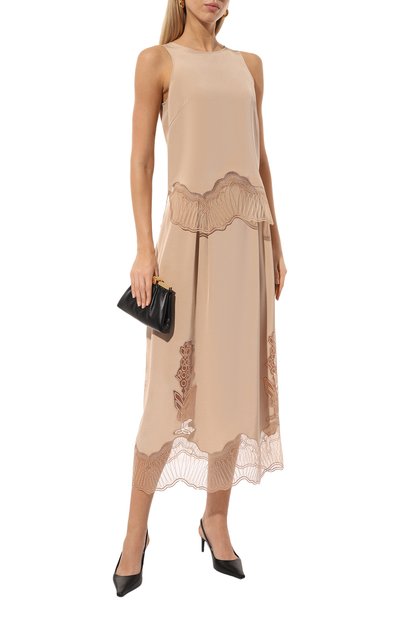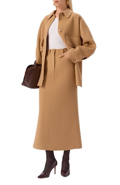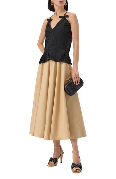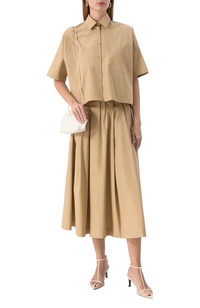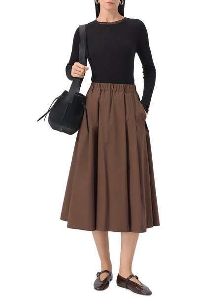 Миди-юбку свободного кроя сшили из матового шелка. Изделие с эластичным поясом и двумя врезными карманами украсили сбоку асимметричной вставкой из цветочного кружева.