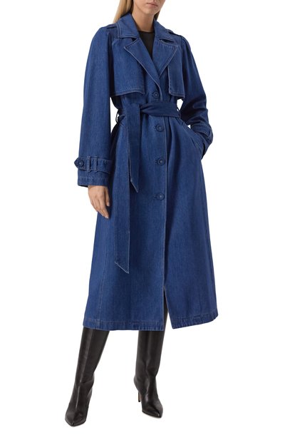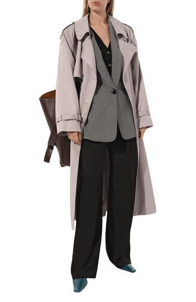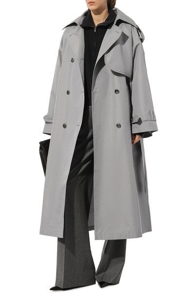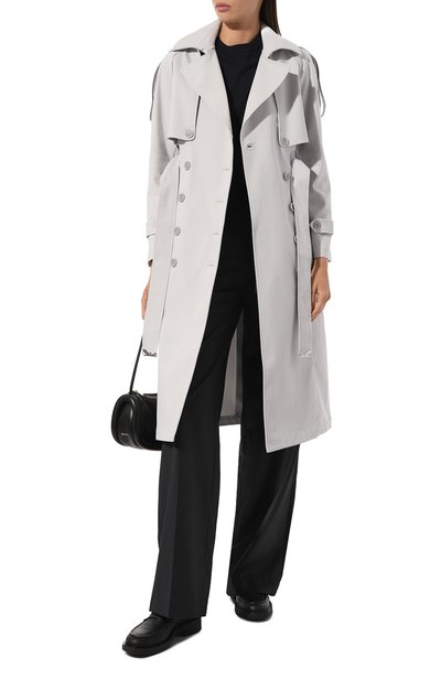 Двубортный тренч с патами на рукавах реглан и шлицей сзади выполнили из чистой шерсти. Модель с двумя боковыми карманами дополнили широким поясом-лентой из такого же материала.
