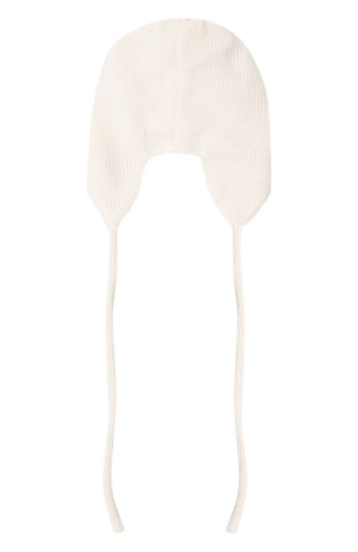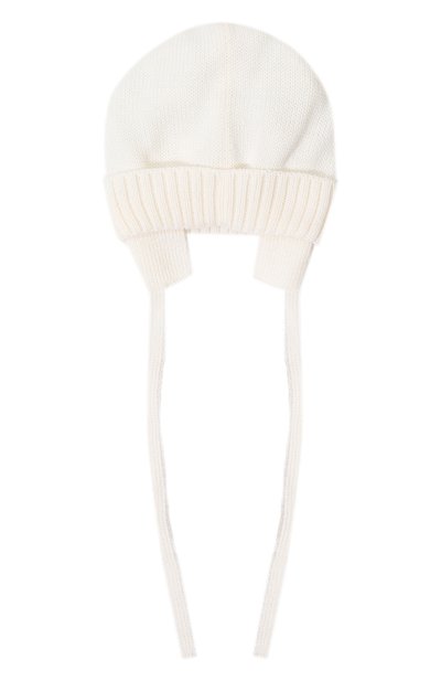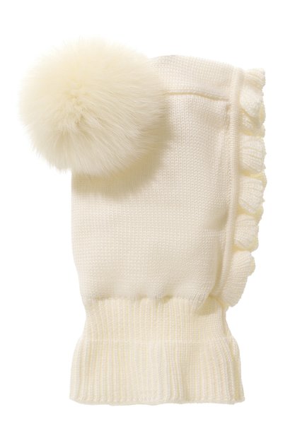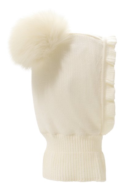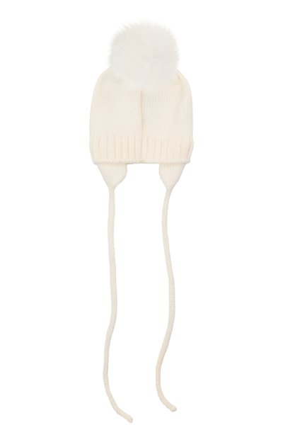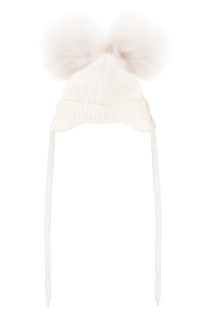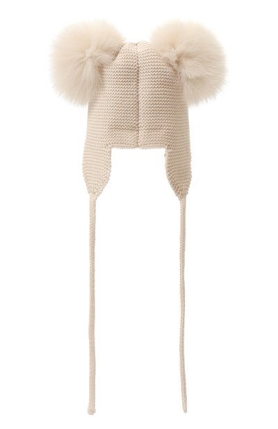 Шапку с хлопковым подкладом связали из пряжи на основе шерсти и акрила. Аксессуар с отворотом на фигурной манжете, дополненной наушниками с лентой, декорировали пушистым помпоном, серебристой подвеской-сердцем и бантами из граненых стразов.