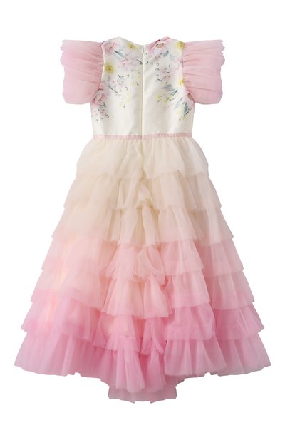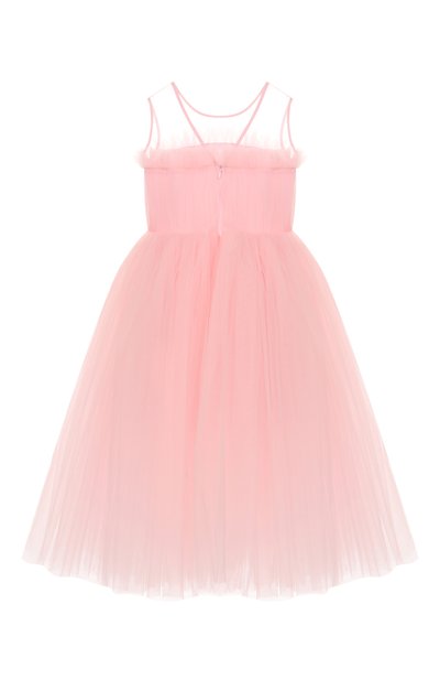 Приталенное платье выполнили из полупрозрачного нейлонового тюля, предусмотрев хлопковый подклад. Горловину, пояс и подол модели на молнии сзади украсили оборками.