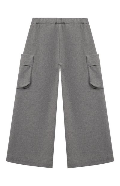 Широкие брюки с эластичной вставкой на поясе сзади выполнили из хлопка с добавлением полиэстера. Один из карманов карго дополнили брендированной пластиной, а передний накладкой подчеркнули нитью бусин с подвеской.