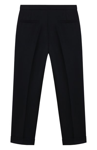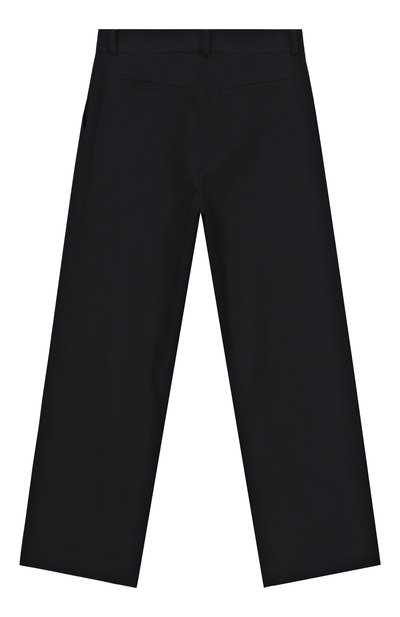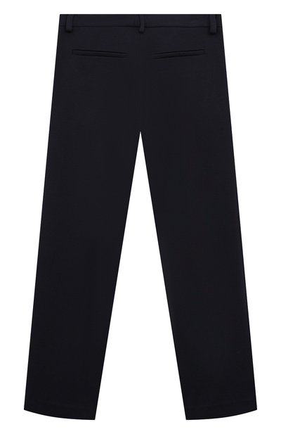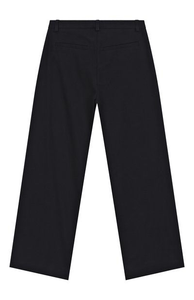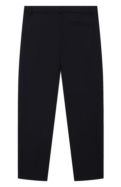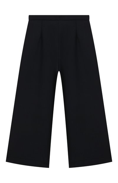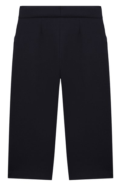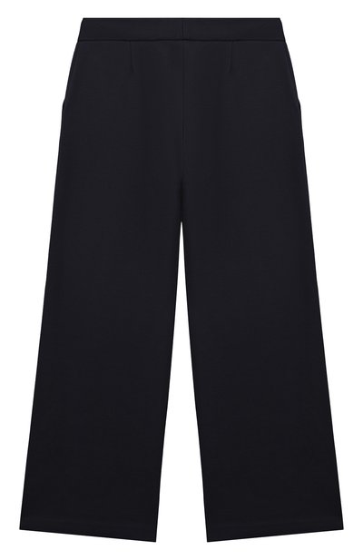 Брюки со встречными складками спереди выполнили из вискозного трикотажа, укрепленного полиамидом. Широкий эластичный пояс модели украсили миниатюрным сердцем.