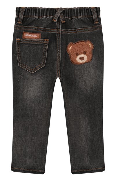 Джинсы с пятью карманами сшили из эластичного хлопкового денима. Модель украсили вышитым патчем в виде брелока-мотоцикла с ключами, которому вторит паттерн на отворотах.
