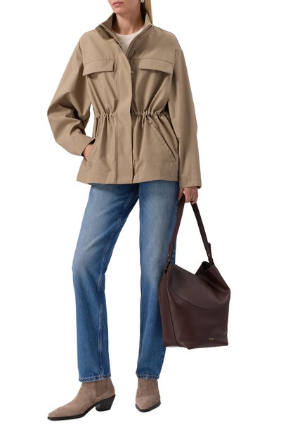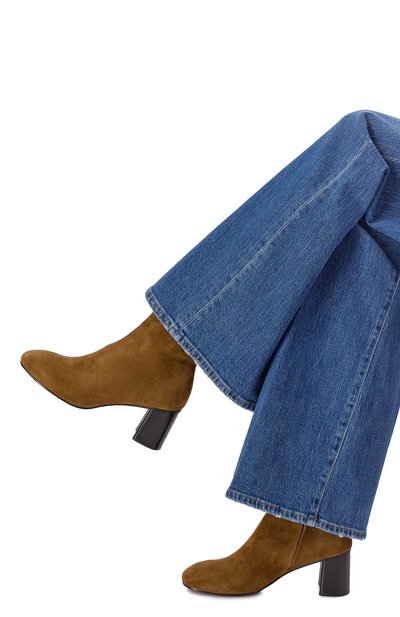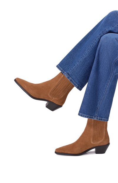 Казаки с внутренней отделкой из козьей кожи шевро выполнили из бархатистой яловой замши. Модель с петлей на заднике и квадратным мысом декорировали вышитым медальоном и строчкой в тон.
