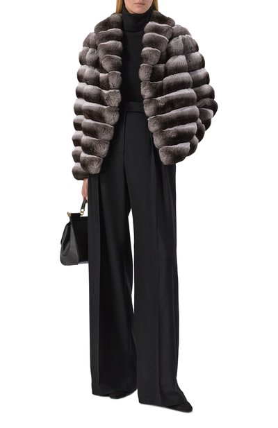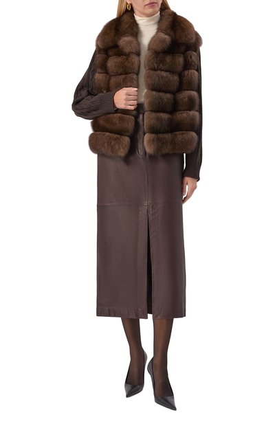 Длинную шубу со шлицей сзади выполнили из меха норки, а для подклада использовали шелк. Модель с потайной застежкой дополнили двумя боковыми карманами.