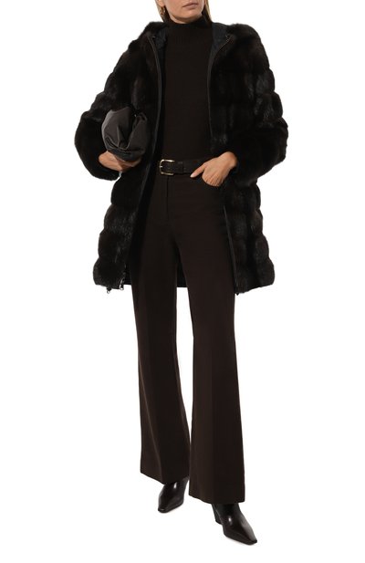 Длинную шубу со шлицей сзади выполнили из меха норки, а для подклада и спользовали шелк. Модель с потайной застежкой дополнили двумя боковыми карманами.