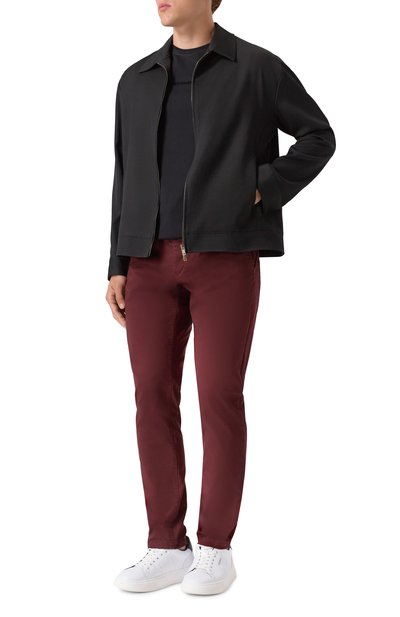 Брюки со стрелками, двумя карманами по бокам и парой листочек сзади дополнили эластичным поясом-кулиской. Для изготовления модели использовали фланель из мериносовой шерсти, сотканную на итальянской фабрике Drago. Чтобы длину изделия можно было отрегулировать точно по росту, брючины остав или неподшитыми.