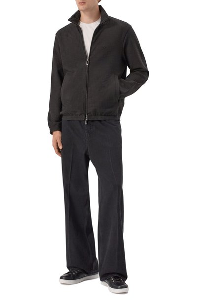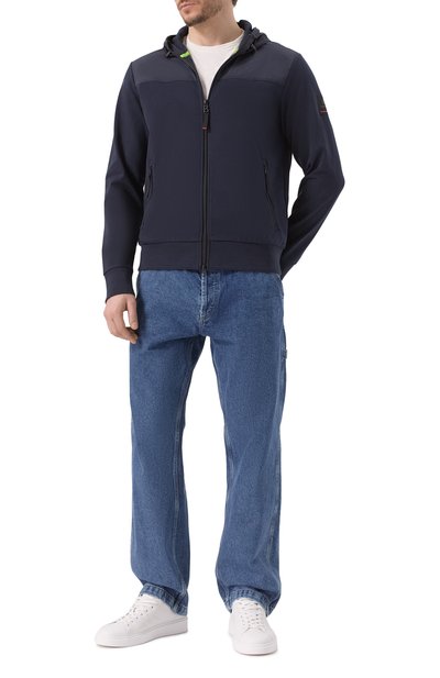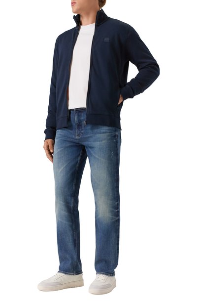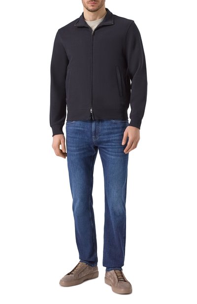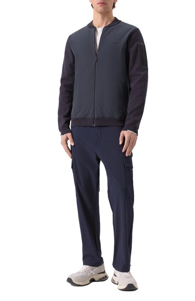 Толстовку с отделкой в рубчик выполнили из усиленного полиэстером плотного хлопкового футера, обработанного щетками. Модель на встречной молнии дополнили боковыми карманами.